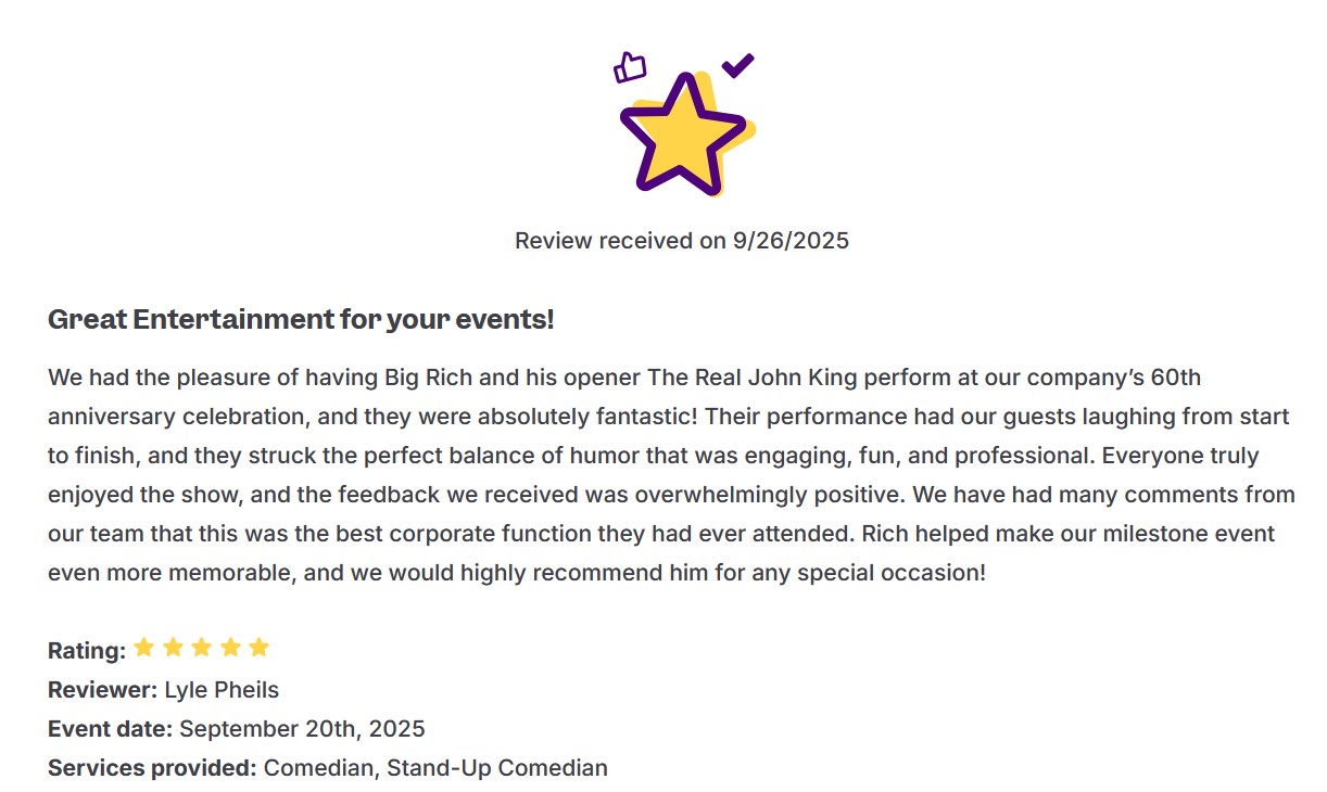 Also, he performs at Comedy Clubs and Night Clubs across the country. Rich covers the full gamut of comedy and the laugh spectrum. Rich has worked with some of the biggest names in show business; Dennis Miller, Phyliss Diller, Emo Phillips, Jeff Dunham, Jeff Foxworthy, Tommy Davidson, George Wilborn, Damon Williams, Rodney Perry, Pierre and Kenny Howell.